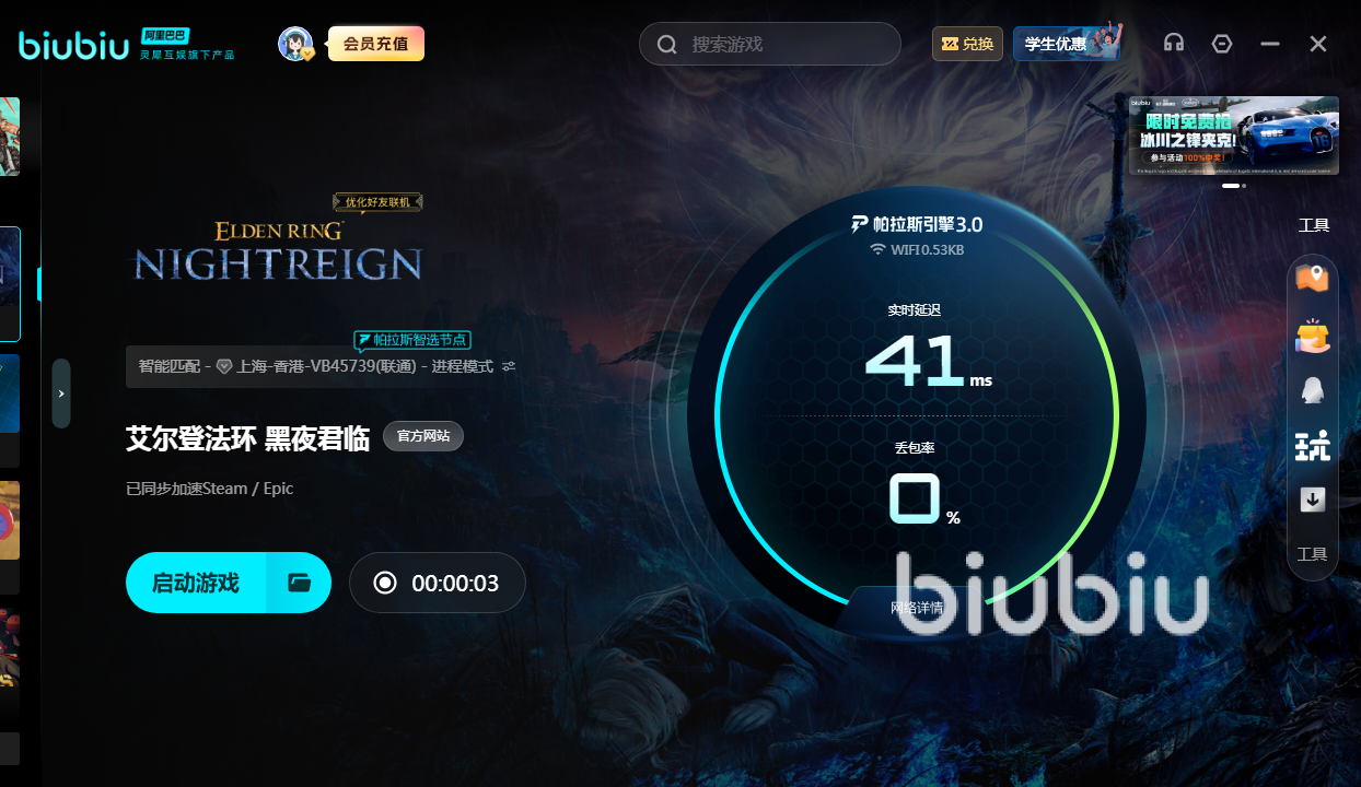 艾尔登法环黑夜君临中的战斗特别危险,太卡的话就不能躲避危机。建议各位用上biubiu,网速变好后才能解决危险,一路高歌到底。要是想先体验一下的话,新人注册后可获得24小时的免费加速;另外新老用户输入兑换码【biubiu不卡顿】,就能额外获得三天免费加速。另外该加速器特地引入引入帕拉斯引擎3.0,和冠军选手Aixleft一起打造,强力升级过后加速效果更好,轻松适应大部分的网络场景。