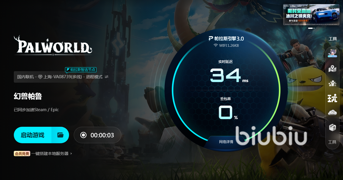 在游戏中玩家可以捕捉超过100种不同类型的帕鲁,利用它们的独特技能和属性去进行战斗以及建设等各种操作。游戏中实现了物品搜集、植物种植、自动化发电等系列设计,给大家带来了非常出色的模拟建造经历。在战斗方面,玩家还可以使用各种武器,和帕鲁一起去挑战野外boss。因为游戏开放了联机模式,最多支持32人同时进行联机,再加上游戏本身在线人数非常高,所以很多时候就容易出现卡顿延迟等问题。今天小编推荐的biubiu加速器,就可以很好解决这些问题。