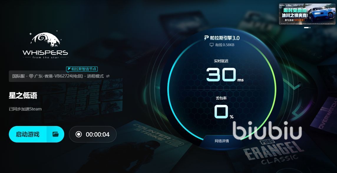 优质的服务下也给大家提供了很多的福利,比如作为首次登录的用户,在首次登陆之后可以在完成注册后得到24h加速时间。【biubiu不卡顿】这句口令,只要是正确的输入小写字母,就能成功的拿到三天的继续加速时间,叠加为96个小时的限免优化时间,降低了试用成本的同时,还能充分的感受流畅无阻的游戏体验。