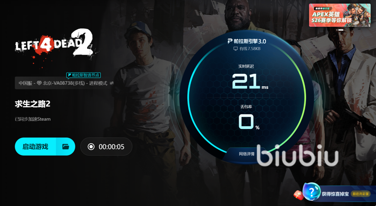 在技术层面,biubiu加速器已全面升级至帕拉斯引擎3.0。这套引擎能够实时检测用户的网络状态,自动甄选延迟最低、丢包率最小的线路,并在链路出现波动时自动切换节点,避免因传输中断造成的闪退。与传统的固定线路不同,帕拉斯引擎3.0具备动态调度功能,可以根据实时状况自适应优化,让整个连接过程始终保持稳定。同时,FPS职业冠军选手Aixleft作为 biubiu体验官,也参与了调优工作。他将职业赛场上对低延迟和高稳定性的严格要求融入其中,使biubiu在处理《求生之路2》这种高实时性的联机场景时表现更加可靠。