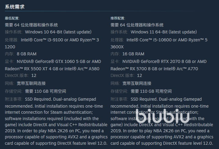 NBA2K26配置要求是什么 NBA2K26配置要求一览
