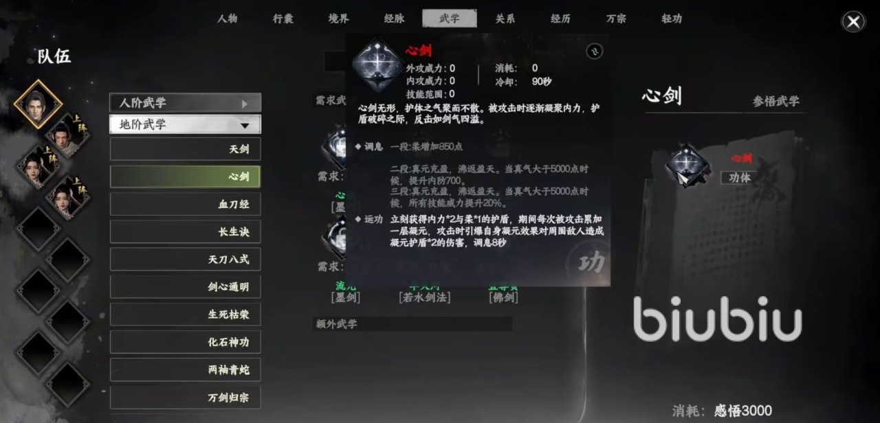 心剑的效果是一段增加柔属性,二段当真气大于5000点时,提升内防,三段是当真气大于5000点时,所有技能威力提升。运功之后立即获得护盾,护盾的数值是内力*2和柔*1,期间每次被攻击可累积一层凝元,在攻击时将自身的凝元效果引爆,对多个敌人造成伤害。百战圣功的效果是增加气血和真气,在战斗中功法自动运行,一段效果可恢复生命和和真气。二段效果是刚属性大于60,技能附加伤害提升,三段效果是在战心劫状态下,每次攻击都会附加额外伤害。运功之后就能触发战心劫,在持续期间内自身要害能力提升,自身受到伤害增加。