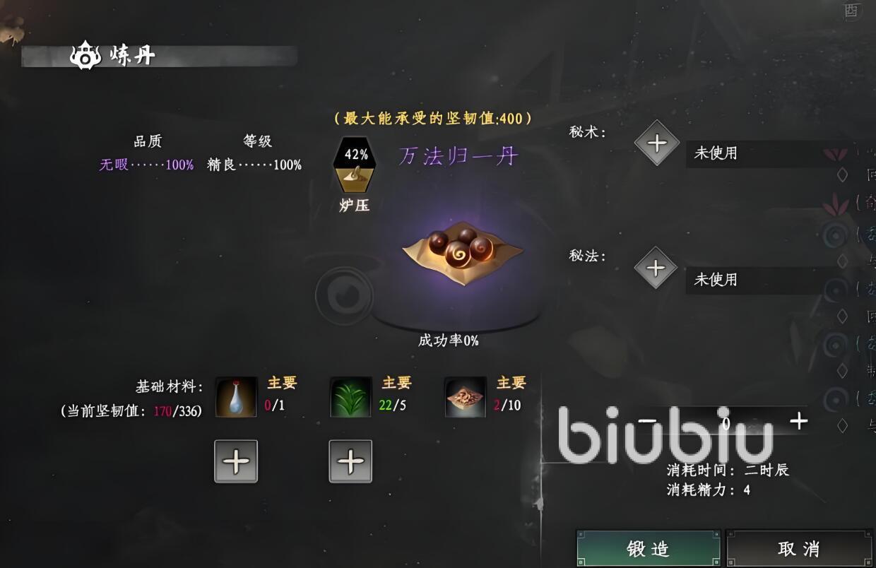 购买配方后,你会发现学习这个功法有前置条件要求——需要玩家的炼丹等级达到3级。如果你的炼丹等级还不够,就需要先提升这项技能,可以通过多次炼制其他丹药来快速提高炼丹经验值。准备好配方并满足炼丹等级要求后,接下来就是收集制作万法归一丹所需的材料。配方要求三种材料:1份血狼精血、5份兰草和10份白芨。其中兰草和白芨是相对常见的草药,玩家在游戏前期的探索过程中很可能已经收集到了一些。如果还没有,可以在游戏世界的各个草丛和药材生长区域仔细寻找,这些草药通常生长在山坡和林地附近。