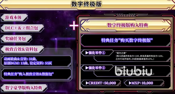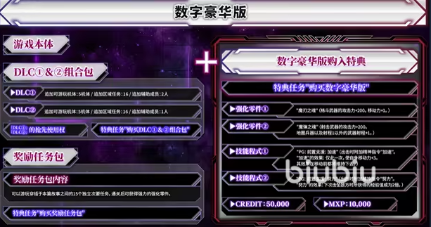首先是普通标准版本,玩家可以得到塞巴斯塔,梵格尼克斯以及古朗凡格和特典任务以及新手礼包。其次是豪华版,在标准版的基础上追加了DLC1和2的组合包,增加了10台机体以及32个区间任务和三名辅助成员。