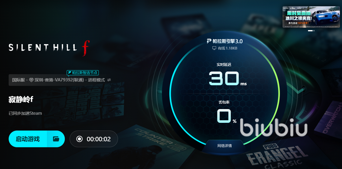 以上就是小编整理的寂静岭f黑屏闪退卡顿延迟丢包怎么办所有内容,通过行业数据来看,玩游戏常遇到的这些诸如黑屏,闪退、卡顿等问题,其实有超过70%都是和网路有关系,而且对于此类问题,预防要明显重要于解决,恰好biubiu加速器所带有智能系统,可以童工监测,提前预判问题的发生,并进行处理。