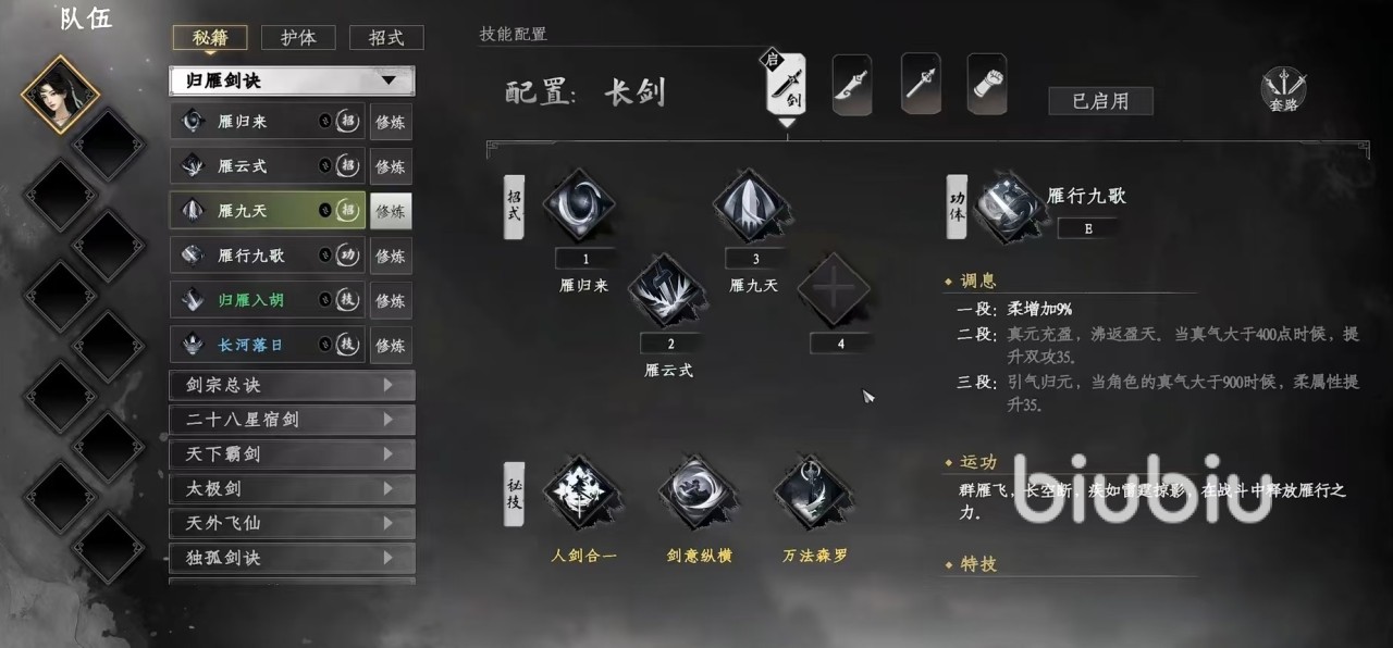 归雁剑决属于操作简单,具有优秀清怪能力的剑法,具有扇形多段伤害和带位移的直线攻击技能,非常适合新手玩家选择,各项能力都比较优秀。暮雪剑法能够造成大量范围伤害并附带寒气效果,在需要群战和控场的场合使用效果出色,能有效限制敌人的行动。剑宗总决是晋升掌门之后获取到的剑法,技能会直接锁定目标,造成伤害爆发稳定,但是范围有限,可以作为过渡剑法使用。
