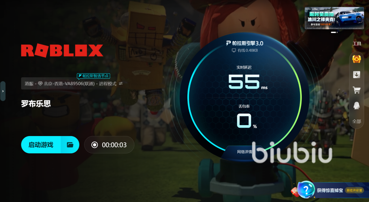 实测结果显示,开启biubiu加速器后,Roblox的运行稳定性有了显著提升。原本在加载大型地图时容易停顿的情况大幅减少,角色移动和战斗判定保持同步,建造模式中的资源加载速度明显加快,不再出现频繁卡顿的现象。即便在晚间高峰期或跨区游玩时,延迟依旧能稳定在低水平,不会再因为网络波动而被迫掉线,整体沉浸感提升明显。