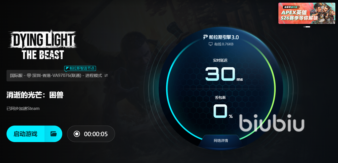 其实无论游戏是因本地网络还是服务器网络发生的问题,本质上是因为游戏数据所依赖的传输道路,因数据传输不畅发生拥堵,发生了数据丢包情况,进而引发一些列问题。所以解决问题的根源,就是要打通数据通道,保持通道的稳定和持续性,通常可使用游戏加速器解决,这里推开大家使用功能大升级后的biubiu加速器。