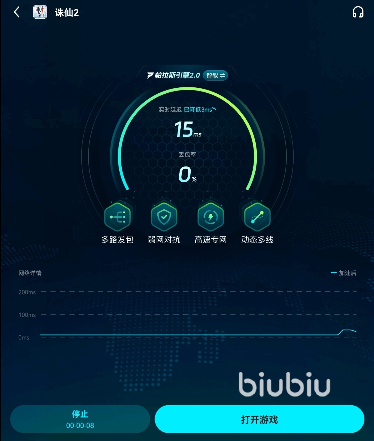 推荐biubiu的理由很多,其中最关键的一点就是biubiu能免费加速手游,加速服务启动后,软件会切换到上图所示的界面,届时无需退出biubiu,就能在应用内启动游戏。