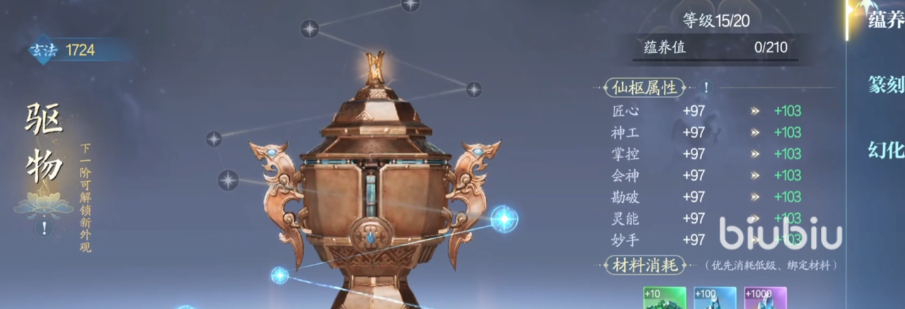 仙枢院的核心玩法是法宝炼制,大家可以通过院内的炉鼎采集天地灵气来炼制法宝。这些法宝不仅造型精美,属性加成也十分可观。炼制时,你甚至可以根据需求进行定制。激活“缔造机制”后,还能修改或增加法宝的词条,并提升技能效果。法宝的品质很大程度上依赖于炼制材料。