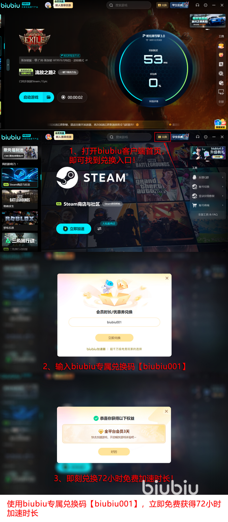 而且biubiu现在活动非常丰富,新用户注册可享受超值福利。系统会自动赠送24小时的免费体验时长,让玩家充分验证加速效果。如果输入特定兑换码【biubiu001】还能额外获得72小时的加速权限,合计96小时的完整使用周期。这些时长足够完成整个剧情模式,或是深度体验一个完整的周末活动。所有赠送时长在高峰时段同样有效,确保玩家在新赛季开服等关键时间点也能顺畅游戏。