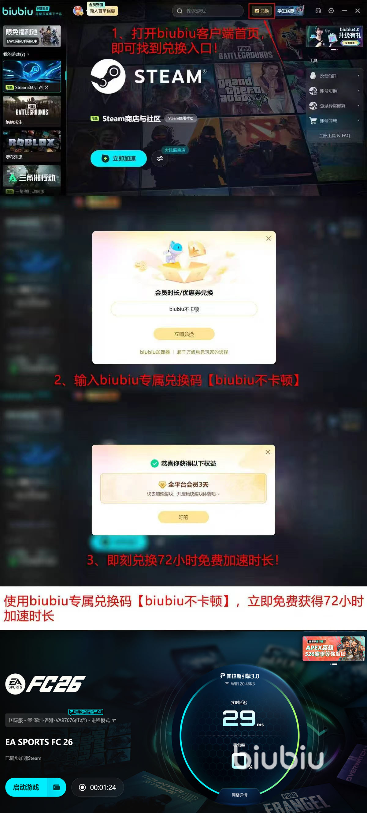 biubiu加速器在界面设计上保持简洁直观,操作起来轻松高效,玩家只需搜索游戏名称就能一键启动加速服务,无需繁琐设置,也完全没有广告打扰,让游戏体验从一开始就干净利落。加速过程中,延迟、丢包率等核心数据会实时显示,让玩家清楚掌握网络状态,不再对“卡顿还是网络问题”感到迷茫。新用户注册后可先体验24小时免费加速,想要更长时间测试的话,输入专属口令【biubiu不卡顿】还能额外兑换72小时,让你有足够时间感受帧率提升和操作顺畅的变化。整体而言,这种设计不仅大幅降低尝试成本,还让玩家能轻松体验到稳定流畅的网络环境,操作手感自然更好,随时随地都能畅快开战,享受游戏乐趣毫无阻碍。