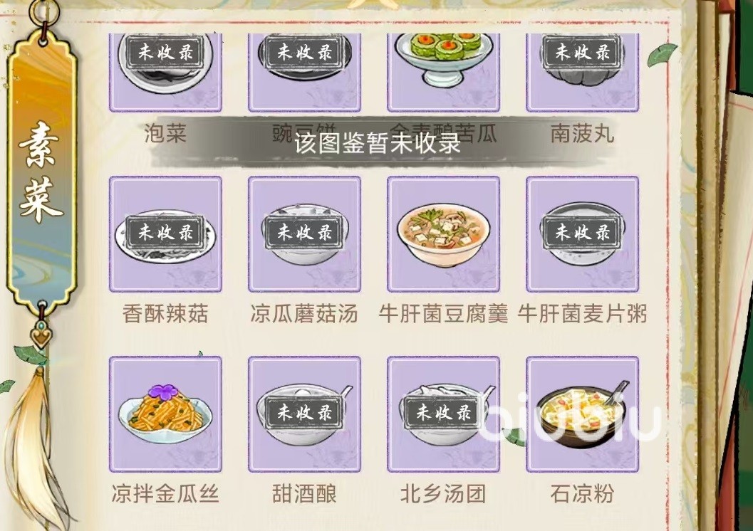 再来看一下素菜类。第1个榴莲豆浆,需要黄豆和榴莲。第2个松茸黄豆煲,需要黄豆和松茸。第3个燕窝米粉,需要大米和燕窝。第4个酸辣土豆丝,需要辣椒土豆和醋。第5个罗汉斋,需要豌豆和蘑菇。第6个三色银钩,需要蘑菇、笋和菠菜。第7个苦瓜焖黄豆,需要黄豆和苦瓜,第8个方便面,需要麦子、辣椒和菠菜。第9个宫廷南瓜,需要大米白糖和南瓜,第9个泡菜,需要辣椒和白菜。