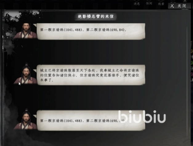 下一站江湖2京谕珠获取办法分享到这里了,主要的方式其实就是接收信件,但是绝影楼总管是随机发送消息的,各位可以时不时点击ESC按键,唤出操作界面,在飞鸽信息栏找到总管,时刻关注坐标信息,快速收集更多的珠子,就可以尽快学成武术了。