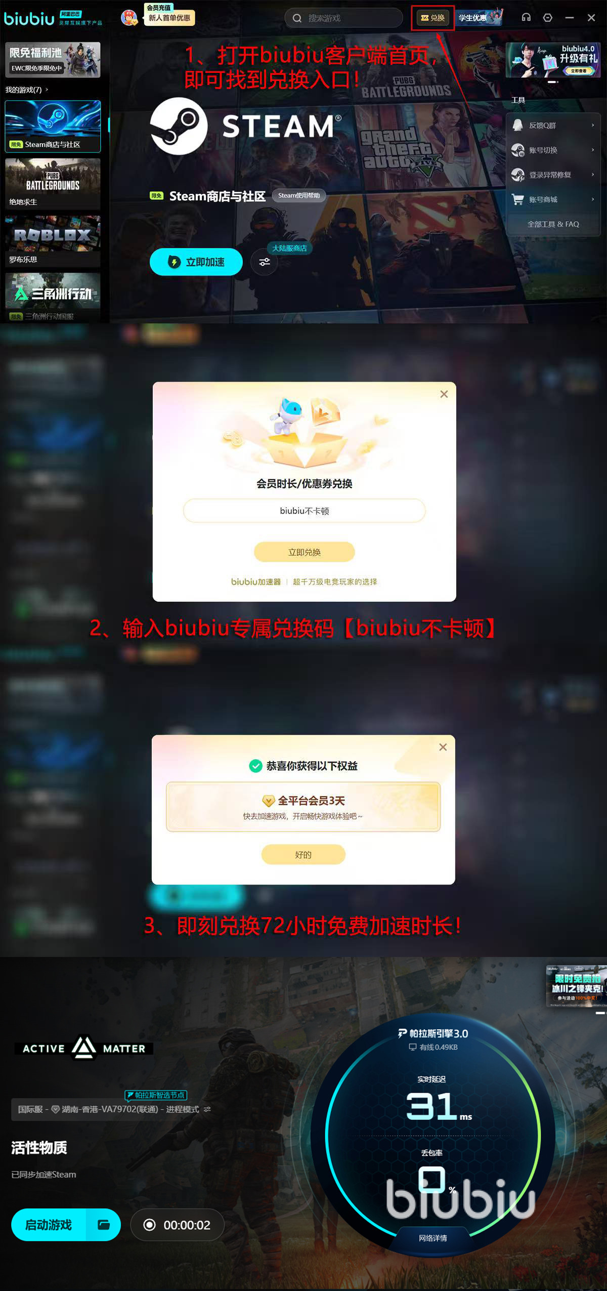 biubiu与冠军选手Aixleft配合创造出目前最强体验版本,为了让更多人玩家体验到,近期有多个免费福利可以领取,新玩家注册就有24小时福利时长,另外,平台所有玩家有一次领取口令福利机会,使用【biubiu不卡顿】在首页领取3天免费时长,新玩家能领所有福利,并且时间能累计到96小时。
