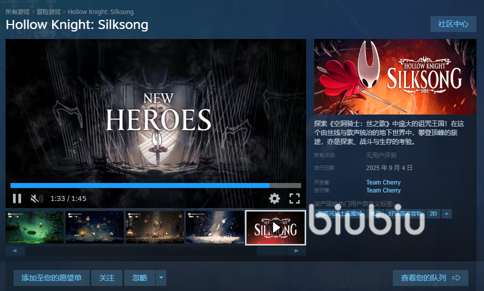 空洞骑士丝之歌steam叫什么大家已经知道了,不过在Steam平台即使输入中文名称也能进行搜索,并且作品页面全面支持中文,大家可以轻松查看游戏介绍、发售日期等详细信息。建议大家先将游戏添加至心愿单,以便在发售价公布后及时完成预购,待游戏正式上线时即可第一时间收到通知,畅快下载并沉浸于全新的冒险故事之中。