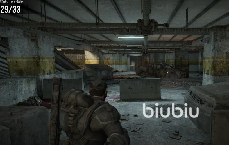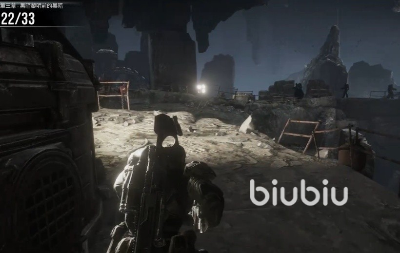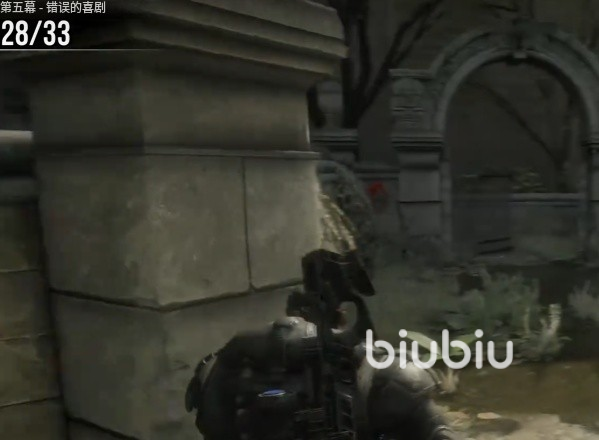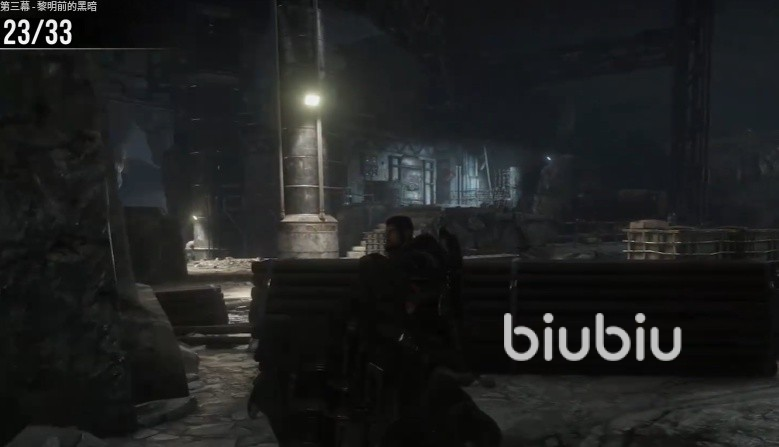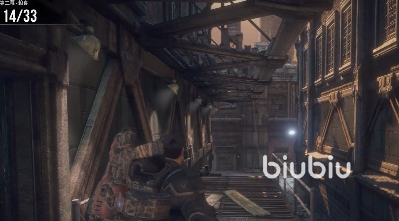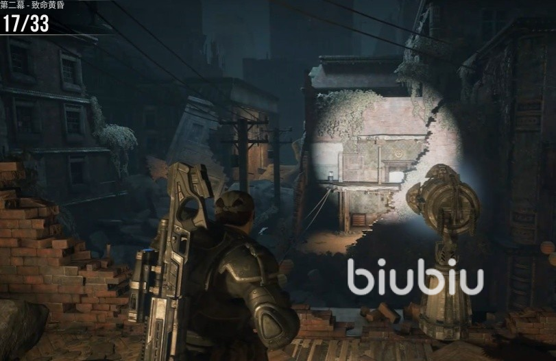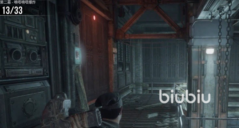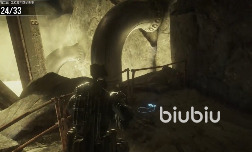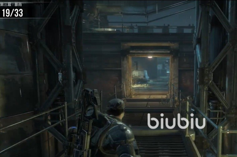 19、第三关暴雨环节中,冲过这片机械建筑,找红色涂鸦,从右侧小道过去,走到桥的尽头就有个。