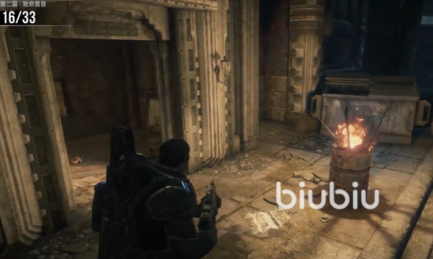 15、下来后找到破旧的中心广场区,在燃烧的汽油桶旁边,石坛后有一个。