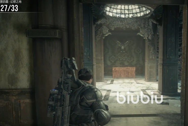 6、罐中之鱼环节中,找到下图中的雕像,往前走,左边的楼梯下面,当下枪口正对着的地方就有一个。