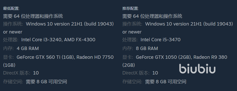 对于希望以基础画质稳定体验的玩家,最低操作系统Windows10,核心处理器可选择性能尚可的英特尔Core i3-3240,需搭配4GB内存,1GB显存AMD Radeon HD 7750即可胜任基础渲染任务,存储空间则需确保至少8GB的可用容量。