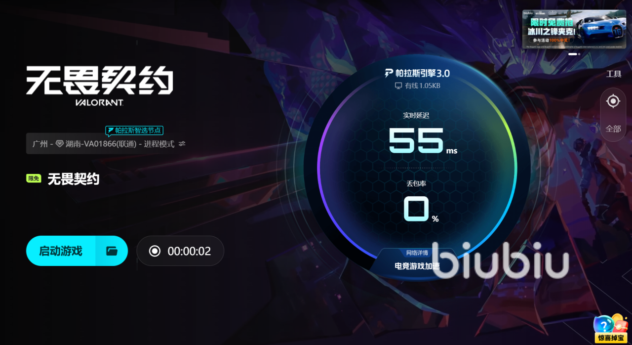 在技术优化方面,biubiu加速器已经接入了帕拉斯引擎3.0。它能实时监测网络状况,智能筛选延迟最低、稳定性最高的线路,并在出现波动或拥堵时快速切换,避免因数据丢包或延迟突增导致的掉帧问题。不同于传统的固定线路模式,帕拉斯引擎3.0强调动态调度与自适应优化,即使在高并发战斗场景下也能维持平稳传输。同时,职业冠军Aixleft也深度参与了产品调优,将他在职业赛场上对低延迟和高稳定性的要求融入方案,使加速器在《无畏契约》这种对实时性要求极高的FPS里依旧保持可靠。