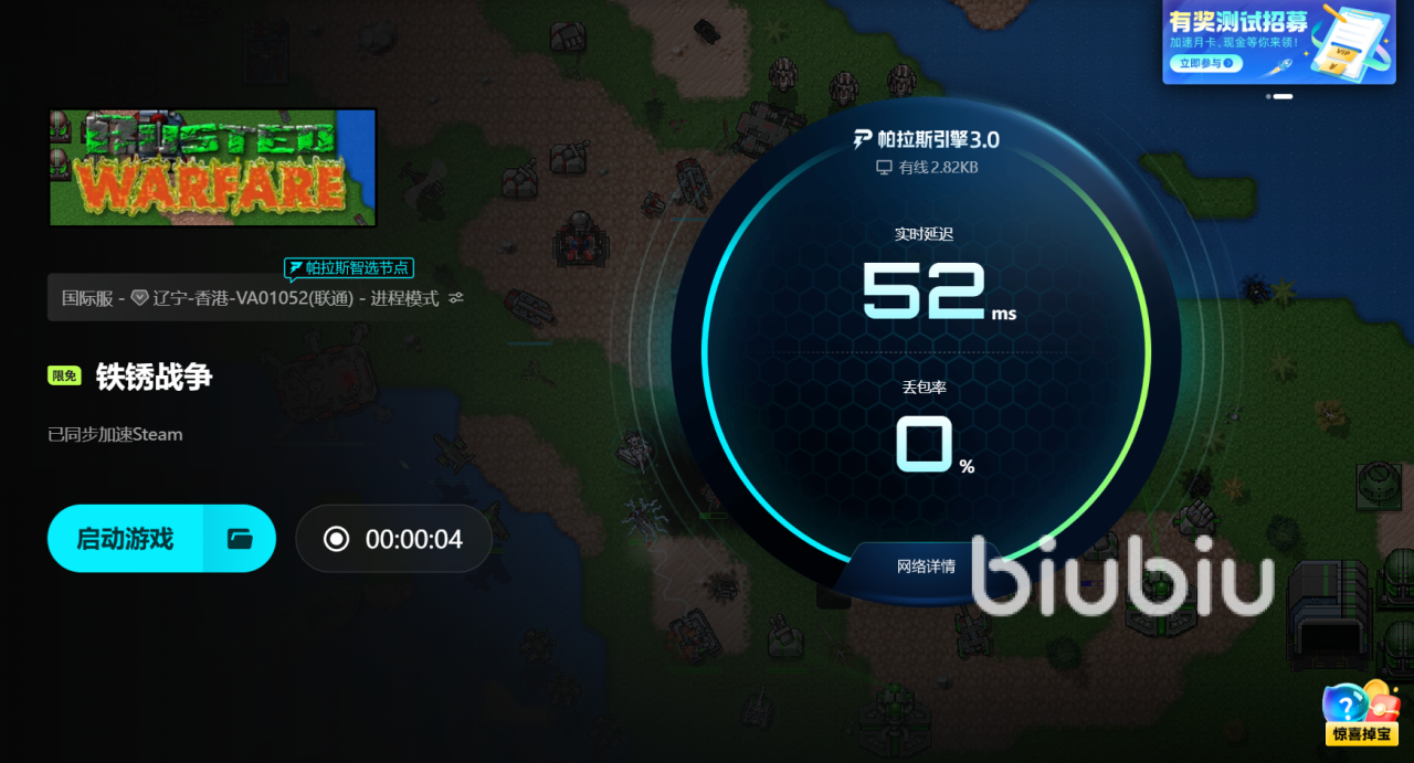 如果你也正在为铁锈战争闪退而烦恼,不妨在进入游戏前先启动biubiu加速器。它能帮助你稳定网络、降低异常,让你更专注于排兵布阵和战术博弈,而不是一次次被闪退打断。只有在顺畅稳定的网络环境下,才能真正发挥策略与操作的魅力,体验到完整的RTS乐趣。