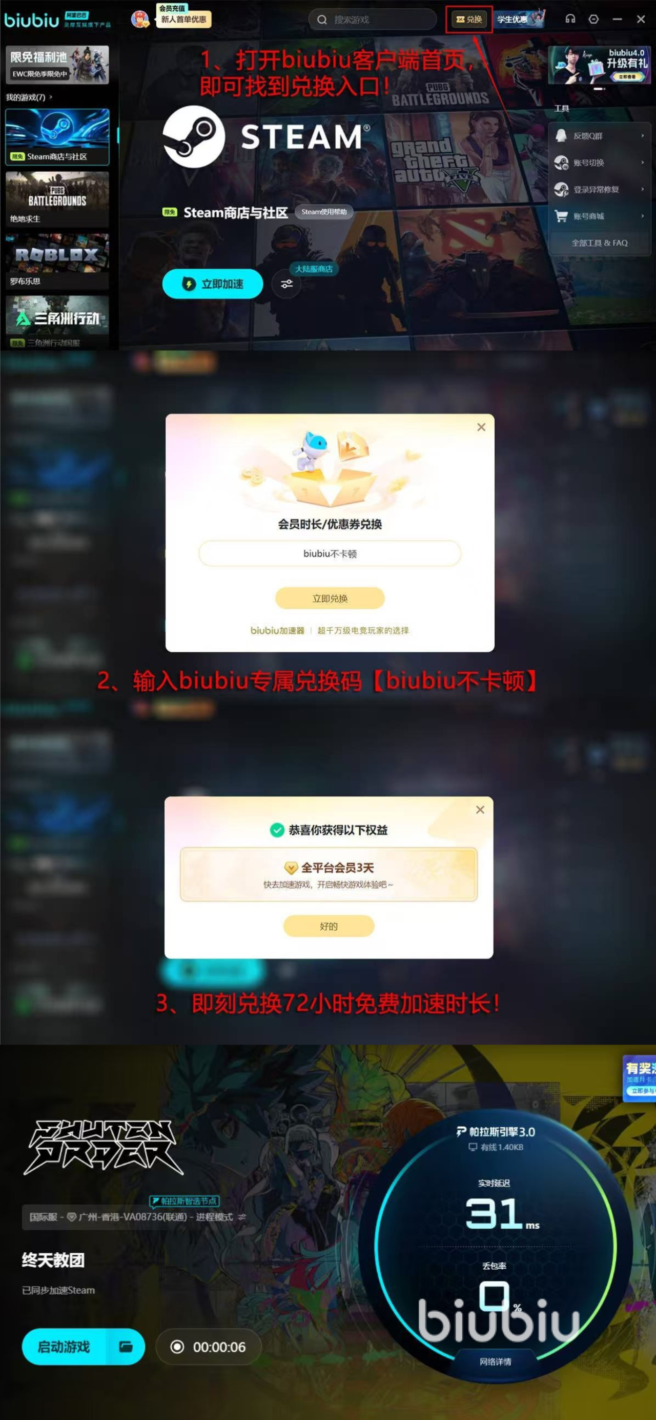如果大家能够达到最低的要求,那么后续还可搭配适合的提速应用,这样在过剧情或者是操作体验的时候都能够享受较为流畅的感受,上方给大家带来的这款应用不仅好用,而且还有超多新人福利,这是考虑到了有的用户之前没有用过该平台,给大家提供了一个能够试验的机会。新人登录注册立刻就能有24小时免费提速服务可以享受。此外平台还给全体用户额外提供三天体验时长,只需在平台的指定区域内填写【biubiu不卡顿】就可以顺利领取到手。