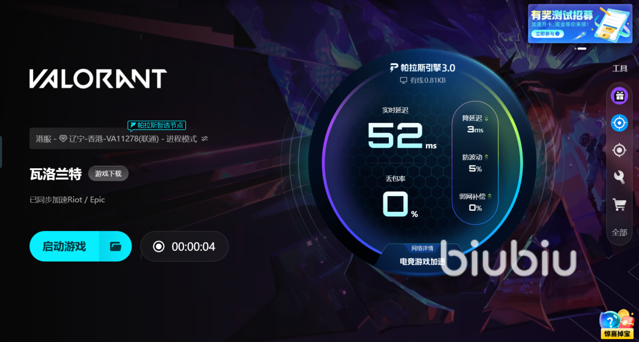 在技术层面,biubiu加速器已全面接入帕拉斯引擎3.0。它能实时检测所有用户的网络环境,动态分配延迟最低的线路,并在链路拥堵或波动时快速切换,避免因丢包或延迟骤增导致卡顿。与传统的固定线路方式不同,帕拉斯引擎3.0强调动态调度和自适应优化,即便在跨区匹配或高并发的对战场景中,也能持续保持稳定表现。FPS冠军Aixleft以biubiu体验官角色参与,他将自己在赛场上积累的低延迟和高稳定性经验直接应用到方案中,使加速器即使在瓦罗兰特这种高度依赖即时响应的竞技游戏中,依旧能保持可靠发挥。无论是快速对枪还是团队配合,都能得到更稳定的网络保障。