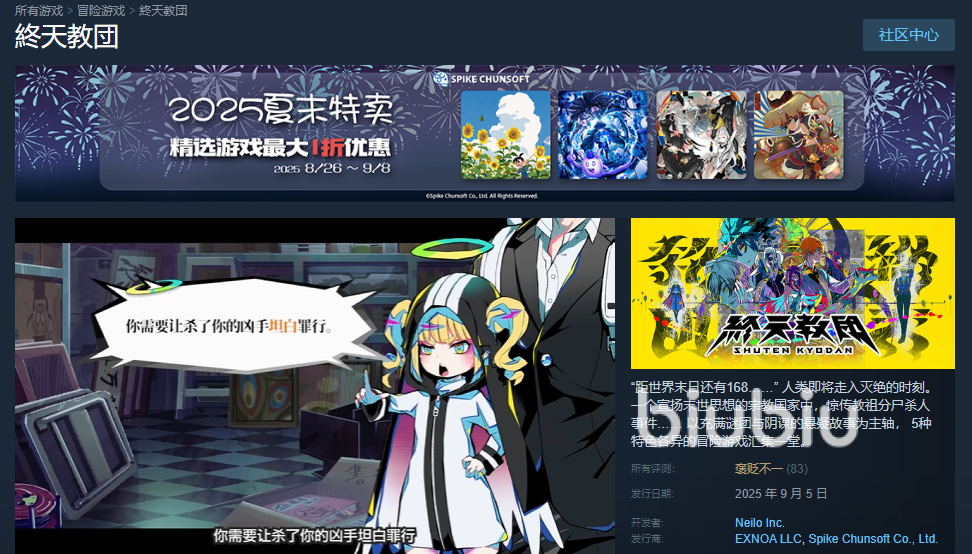 2025年09月09日 14:46 来源:名刀欲海刺龙终天教团steam叫什么?这是一款色彩饱和度都很高的游戏,不少小伙伴对这类的作品都十分好奇,而且大家也知道会在steam平台上线,所以想知道在那里这个游戏叫什么,方便自己搜索并下载。我去的steam该作品的名字叫做終天教団,如果大家用的是其他版本的steam也可以选择用SHUTEN ORDER英文名称进行搜索。