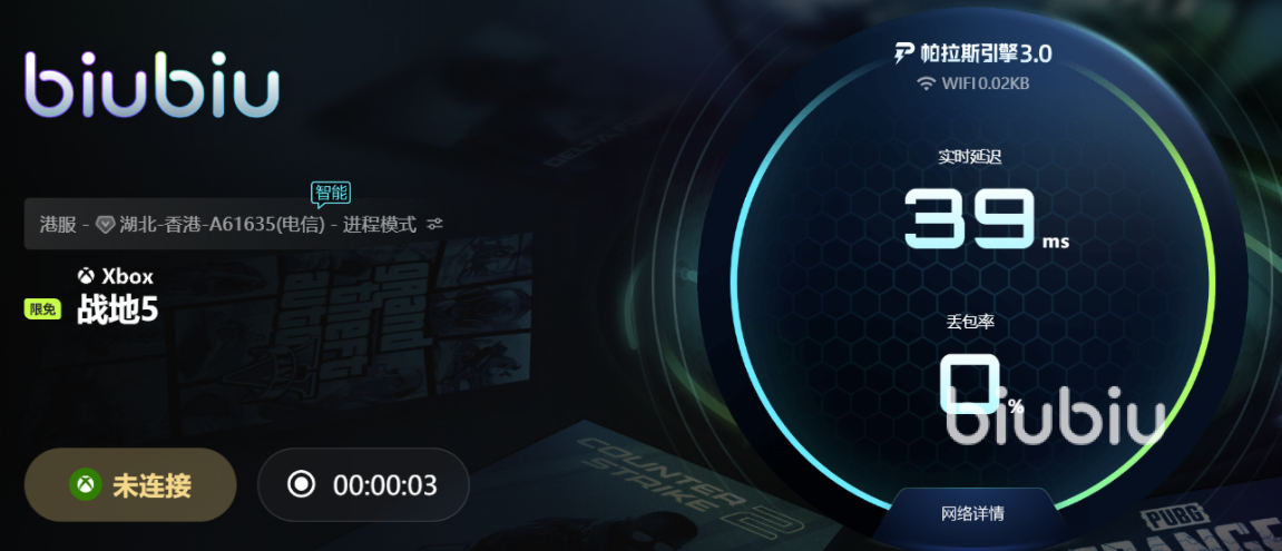 biubiu加速器与冠军选手Aixleft合作,并引入帕拉斯引擎3.0,能实时扫描全球《战地五》服务器节点,根据玩家所在位置自动筛选延迟最低、稳定性最高的节点,缩短数据传输距离;同时具备动态带宽分配能力,在多人模式匹配、联合作战任务同步时,优先为游戏数据分配带宽,避免其他应用抢占资源导致的数据传输中断;此外,帕拉斯引擎3.0还能减少数据丢包,确保匹配指令、战场数据完整传递至服务器。经实际应用,
