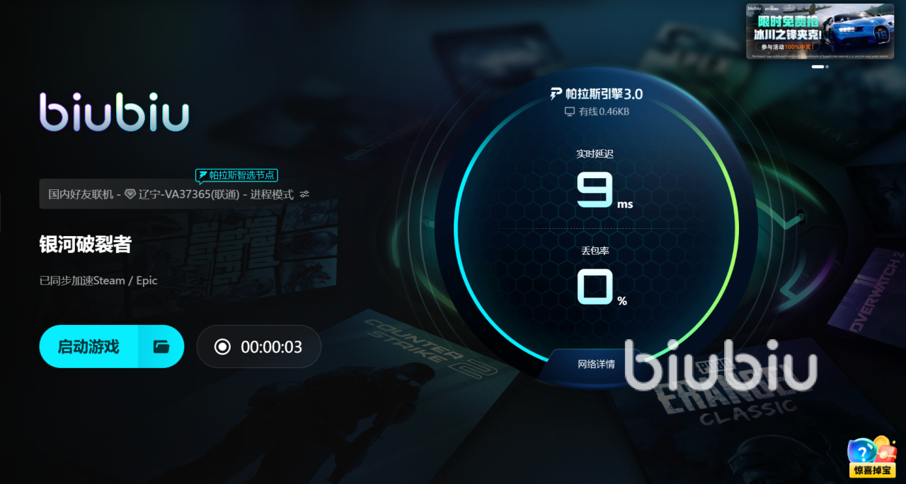 技术层面,biubiu加速器全面地接入了帕拉斯引擎3.0。这项核心技术对网络情况能够实时检测玩家的动态,动态分配延迟最低、稳定性最强的线路,并在链路出现拥堵或波动时即时切换,改善因延迟突增,丢包导致进不去的情况。固定线路的传统的不同,这个引擎会通过动态的调度机制与自适应优化策略,即便在网络压力极大的情况下,依旧能够维持顺畅稳定不掉线的连接。职业Aixleft,身为biubiu体验官的FPS冠军,亲自把控优化,并把自己在职业比赛中对低延迟与稳定性的严格标准融合其中,让加速器在应对《银河破裂者》这种高并发多人环境时依旧稳定可靠。