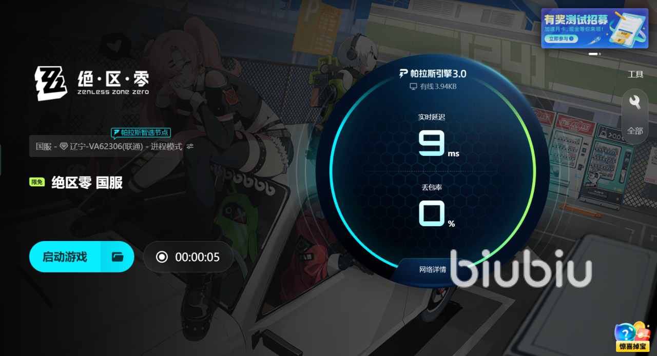 如果你也正在为电脑玩绝区零闪退而苦恼,进入游戏前提前启动biubiu加速器,会让你的网络更顺畅,同时有效减少意外中断的情况。让你把注意力放在战斗与剧情探索中,而不是一次次被闪退中断的无奈里。只有保持稳定的环境,才能真正释放游戏的魅力。