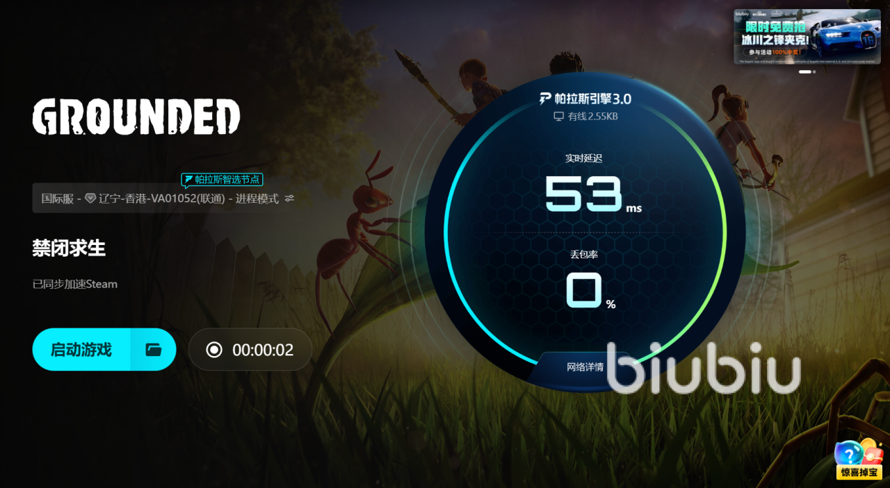 为了帮助玩家大大改善这些闹心事,biubiu加速器推出了福利活动。首次注册的新用户可以立即领取24小时免费加速时长,零门槛体验加速效果;同时,所有玩家在客户端首页【兑换】界面输入口令【biubiu不卡顿】,还能额外再获得72小时的三天的免费的使用时长。这样就会有三天的稳定时长保障,不仅适用于《Grounded》,也能在FPS、MOBA、MMO等众多热门网游中发挥作用,让玩家更直观地感受到了更多的优化带来的网络提升。