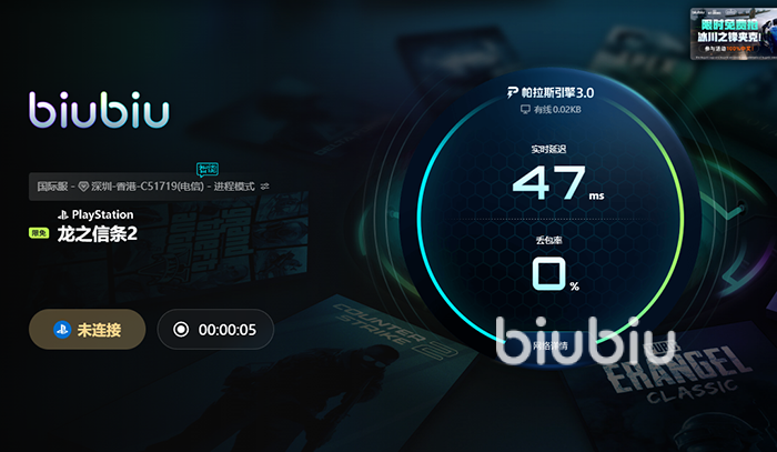 事实上无论是网络上的何种原因造成的,在网络因素的实质是,游戏运行过程中产生的大量数据,如帧数据、动作数据、技能数据等,无法完整的在客户端和服务器之间相互传输,出现丢包、延迟发送等问题,在游戏中就表现为闪退,卡顿等现象。所以解决常见的网络问题,最好的办法是先疏通网络,稳定网络传输。通常解决方法是使用游戏加速器,这里有一款刚完成技术升级的加速器推荐给大家——biubiu加速器。