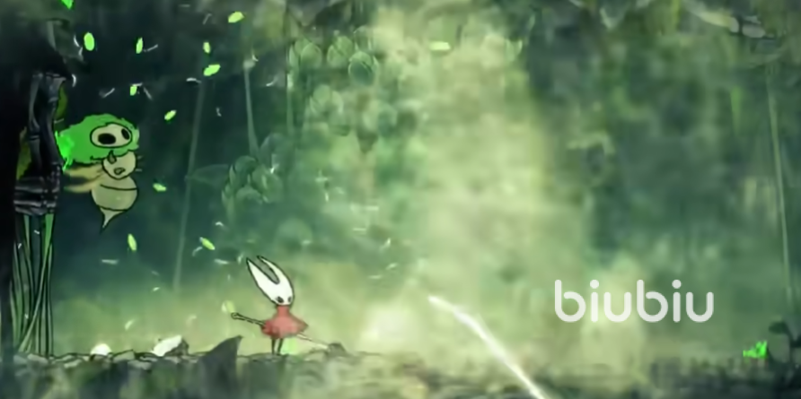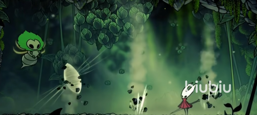 然后从长椅这里往右侧走,一层层的爬上平台顶,斩断左边挡路的苔藓就能进入boss区域。该怪物只有比较基础的攻击模式,玩家掌握好对空战斗技巧以及俯冲闪避的能力就能轻松躲过。一开战boss会先从房间一侧上下漂浮,然后快速的贴向地面进行冲刺,玩家只要在其缓慢上升的时候观察到,然后跳跃进行斩击,听到它开始尖啸的时候躲开,就能避免伤害。