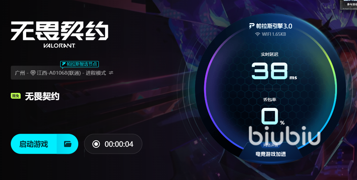 其次需重点排查网络因素对闪退的影响。很多玩家认为闪退仅与设备相关,却忽略了无畏契约的联网特性,游戏启动时需完成服务器验证,对战加载阶段要同步地图数据与玩家信息,若网络连接不稳定,数据传输中断或延迟过高,会触发客户端 “数据校验失败”,直接导致闪退。这种情况下,单纯调整设备设置无法解决问题,需借助专业工具优化网络连接,biubiu加速器便是适配性较强的选择。
