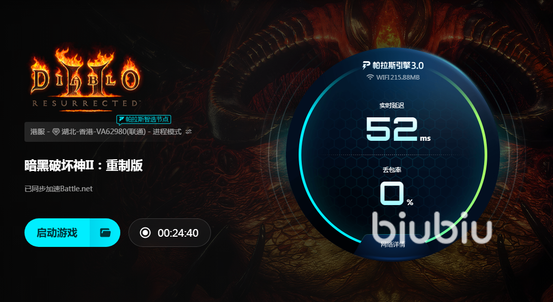 在操作方面,通过上面的链接可直接下载biubiu完成安装,然后要输入需要加速的游戏名称,注意要输入全称,这款游戏的全称是暗黑破坏神 II:重制版,大家直接复制搜索,不然是搜不到的。搜索到之后点击开始加速,就可以进入到加速界面里了。在这里直接打开客户端运行游戏,至于其他就不用担心,biubiu会在后台自动进行操作,包括选择出合适的节点连接,根据用户网络波动情况随时进行切换等,这些技术都源自biubiu所使用的帕拉斯引擎3.0,该引擎在进行重磅升级之后,相比之前有着更优秀的加速效果。还有一项优势是在升级过程中还邀请到了冠军选手Aixleft一起合力进行打造,所以在加速效果方面绝对值得信赖。