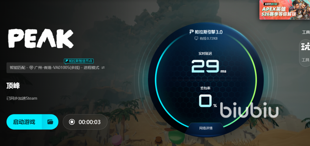biubiu加速器的专业性首先体现在技术架构的优势上。它与冠军选手Aixleft达成合作,并引入帕拉斯引擎3.0,针对游戏数据传输的特性做了专项优化。帕拉斯引擎 3.0 能够实时监测全球网络节点状态,智能分析玩家所在区域与目标服务器之间的传输路径,自动避开拥堵、信号干扰的节点,为游戏数据开辟专属传输通道。不同于普通加速器的通用路径优化,biubiu会根据游戏类型的不同,调整数据传输优先级,例如对射击游戏的操作指令、MOBA 游戏的技能释放数据进行优先传输,有效降低延迟波动,减少数据丢包率。这种针对性的技术优化,让biubiu在处理各类游戏的网络需求时,比通用型加速器更具专业性,能切实解决玩家在不同游戏场景中遇到的网络问题。