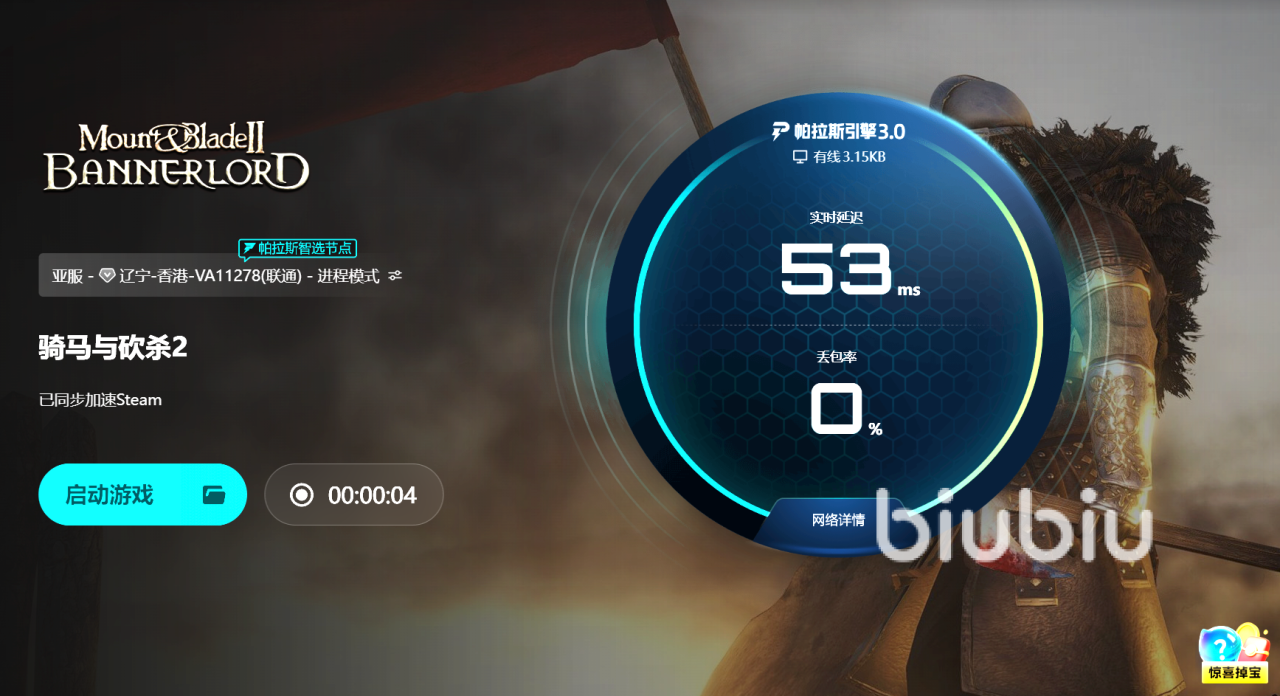 在技术层面,biubiu加速器已经全面升级至帕拉斯引擎3.0。这项核心技术能够实时检测用户的网络状况,动态分配延迟最低、稳定性最强的线路,在网络波动或拥堵时能迅速切换线路,从而减少丢包与延迟过大的情况导致闪退。相比传统固定线路方式更灵活,帕拉斯引擎3.0强调动态调度和自适应优化,即便在大规模攻城战或长时间挂机运行时,也能保持连接稳定。更有亮点的是,FPS冠军Aixleft担任biubiu体验官,并全程加入到优化过程中。他将职业赛场上对低延迟和高稳定性的极致需求融入到优化方案中,使加速器在应对《骑马与砍杀2》这种包含大规模运算与多人互动的复杂环境时,依旧能够稳定表现。这种高标准的优化,让玩家在作战与策略布局中少受干扰,能更好地发挥操作与指挥。
