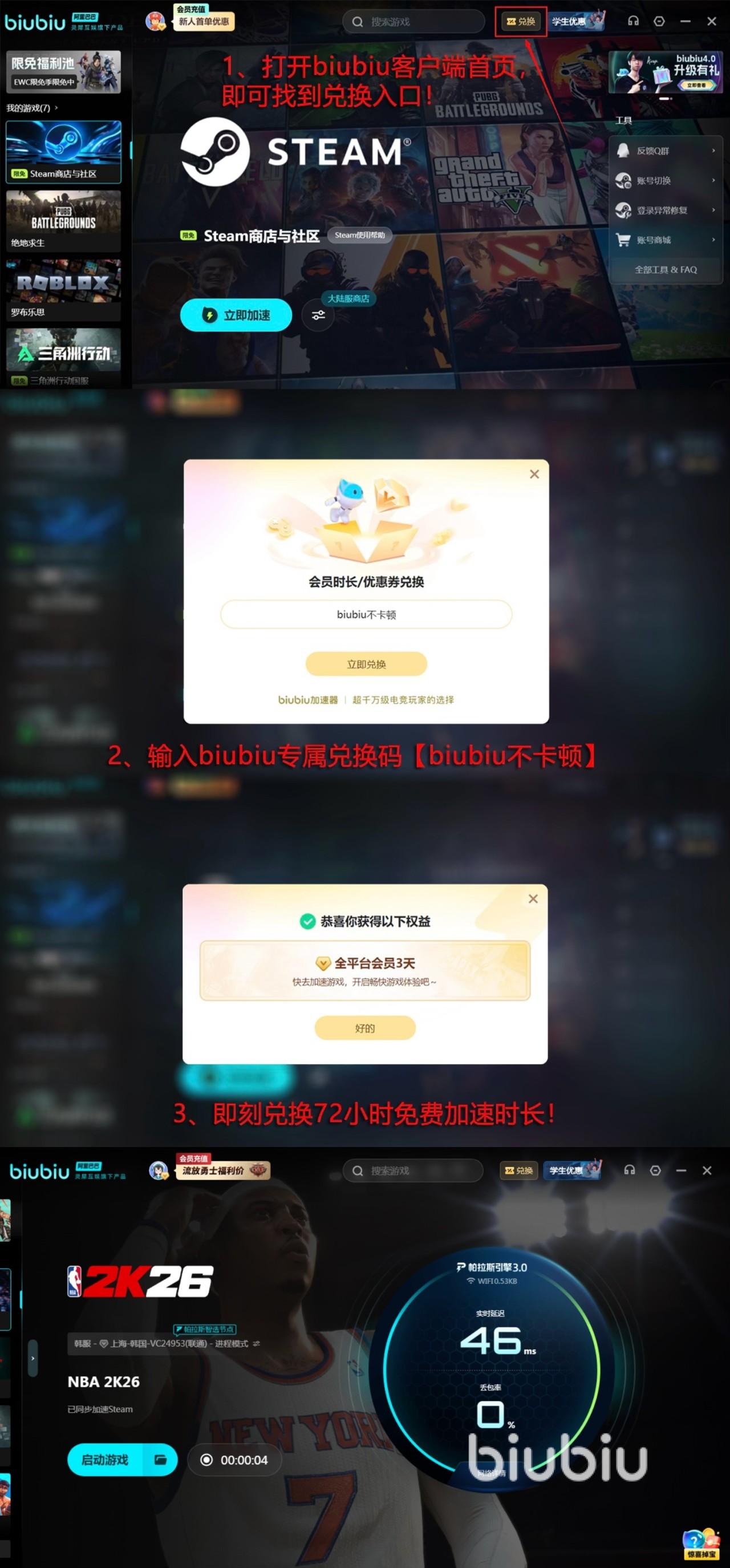 nba2k26操作需要耐心和练习,不要急于求成。刚开始时可以先在训练模式中反复练习,熟悉每个动作的触发方式。随着熟练度提高,你会发现自己在比赛中更加从容,能更好地应对各种情况。对于线上对战,一个稳定的网络环境至关重要。新人注册biubiu加速器可享免费加速24小时,而新老用户使用兑换码【biubiu不卡顿】可获得3天免费加速。值得一提的是,现在的biubiu加速器重磅升级,引入了全新的帕拉斯引擎3.0,还联合冠军选手Aixleft进行了调校,旨在为用户的联机体验提供更低的延迟和更稳定的连接。