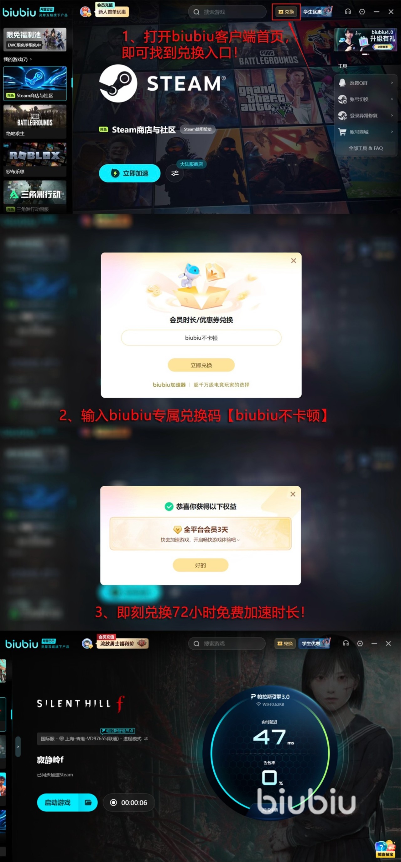 对于国内玩家来说,想要流畅体验寂静岭f的在线内容,稳定的网络环境非常重要。为了便于新用户试用,biubiu加速器向新用户赠送了24小时加速时间,并且所有用户使用兑换码【biubiu不卡顿】后,都能还额外获得3天的加速时长,这意味着玩家可以充分测试加速效果。除了上面的福利外,biubiu加速器还在功能上完成了重磅升级,一个是引入了帕拉斯引擎3.0,另一个则是联合冠军选手Aixleft调试功能,确保每个用户都能享受优质的加速服务。