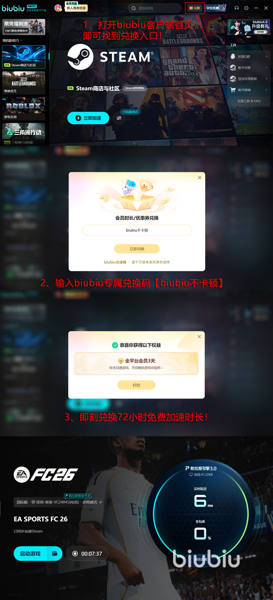 没用过biubiu加速器的玩家,可以注册新用户,免费领取24小时的加速时长,先感受一下biubiu加速器效果。为了回馈广大的biubiu用户群体,现在官方给大家带来了一个小小的福利,使用兑换码【biubiu不卡顿】,免费领取3天的加速时长,新老用户都可以领取哦~兑换码长期有效,大家看到不用担心过期,赶紧去领取吧。