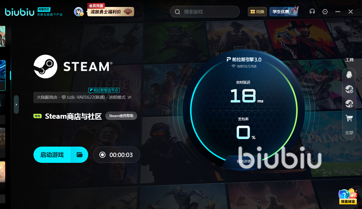 biubiu加速器具备很多功能,几乎可以解决各种网络引起的问题。比如说steam平台的加载问题——除了常见的登录卡在界面无法登录,还包括商店页面图片加载缓慢、游戏更新时进度条停滞等情况,而biubiu会自动修复这类网络问题,保障steam使用流程顺畅。并且新人在注册后便能获得24小时免费加速时长,新老用户使用兑换码【biubiu不卡顿】还可额外获得3天免费的使用权,足够玩家测试加速效果。