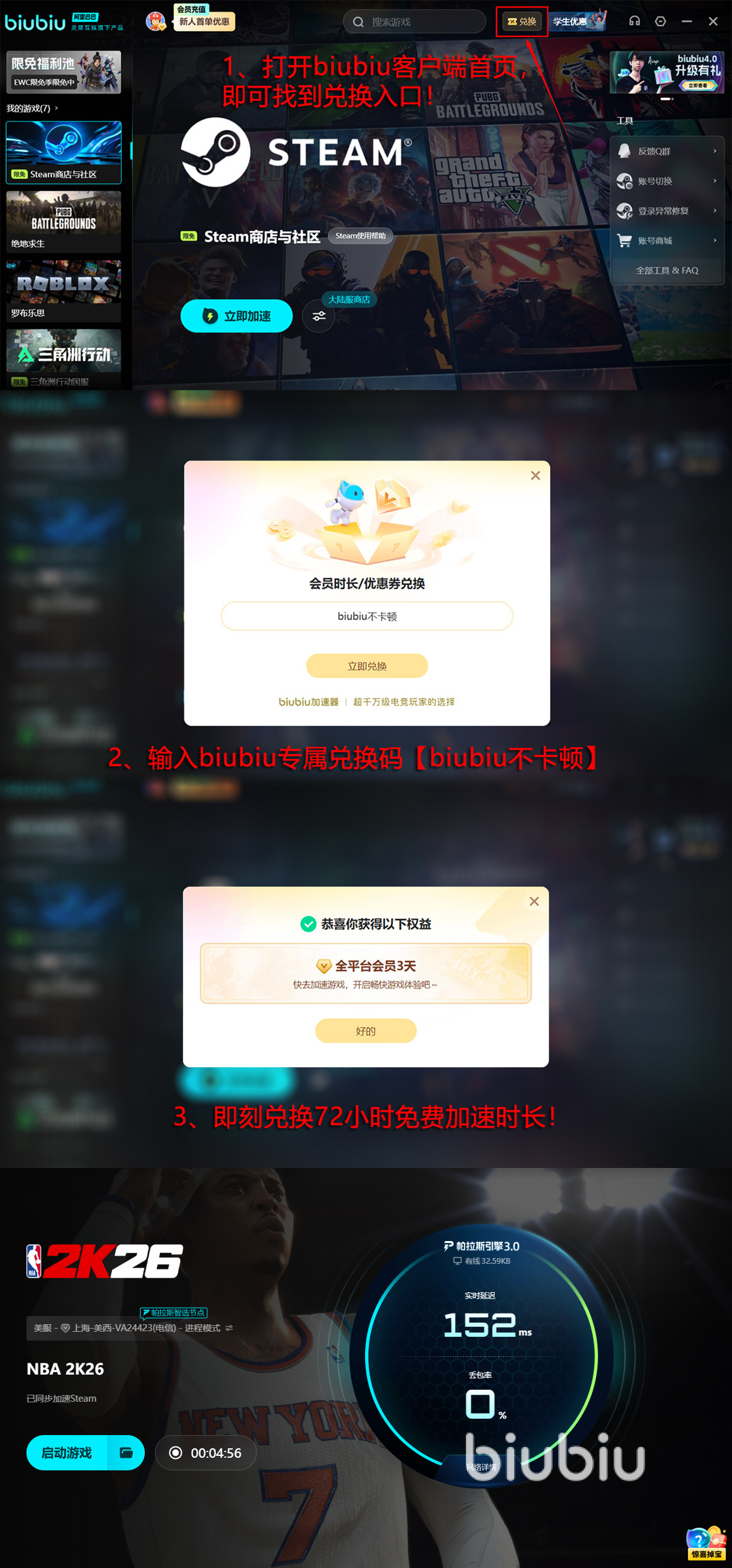 新用户注册 biubiu 加速器,就能先拿到 24 小时免费加速,畅玩游戏不卡顿!不仅如此,新老用户还可以使用兑换码【biubiu不卡顿】,直接领取3天免费加速时长,长期有效,无需担心过期。无论你是刚入坑的新玩家,还是老玩家,轻松畅玩游戏、告别卡顿,从此体验更顺畅的竞技乐趣!