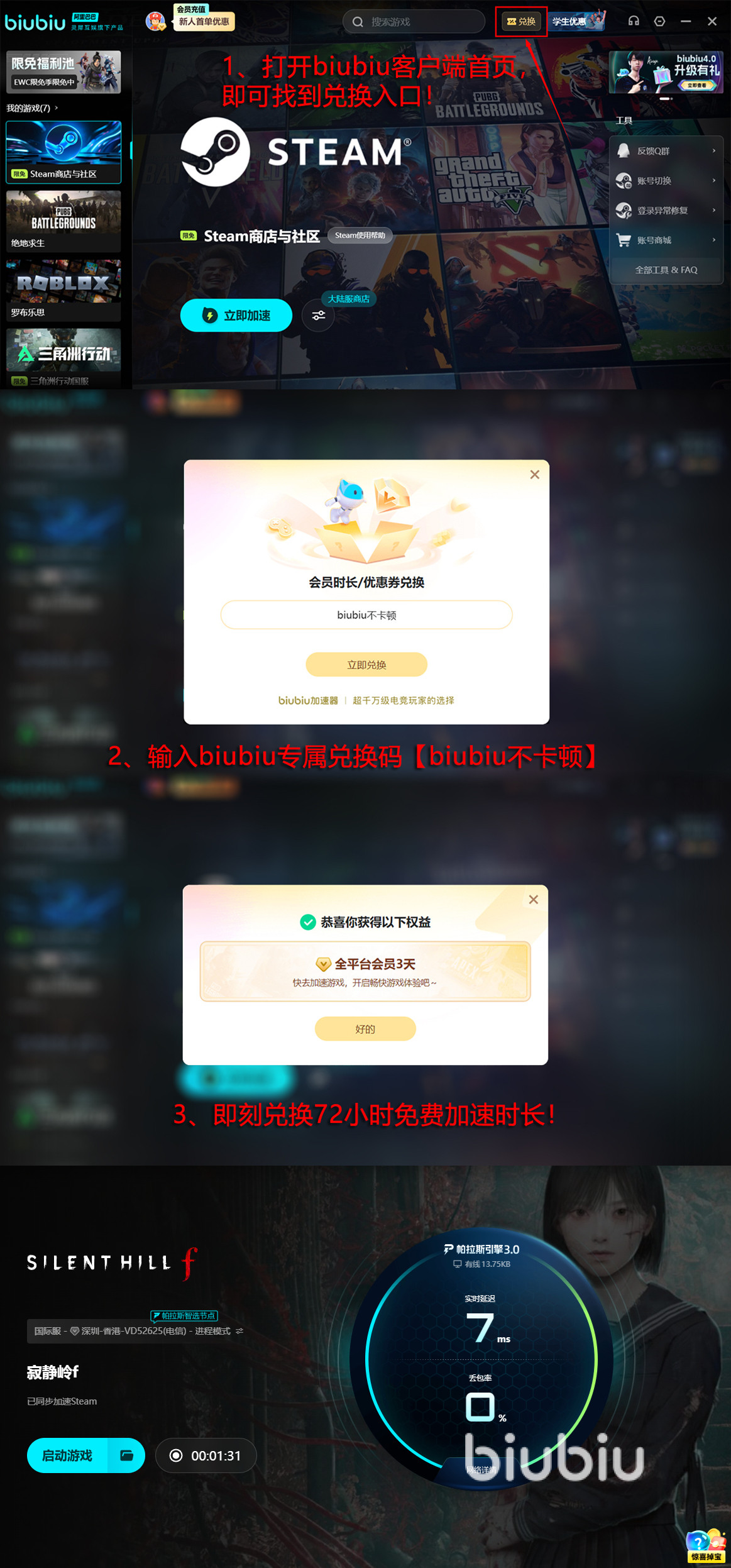 现在biubiu加速器新用户注册,即可免费领取24小时的加速时长,大家可以先免费体验一下biubiu加速器是否好用。另外小编还有一个福利要带给大家。现在新老用户使用兑换码【biubiu不卡顿】,就能免费领取3天的免费加速时长,兑换码长期有效哦。