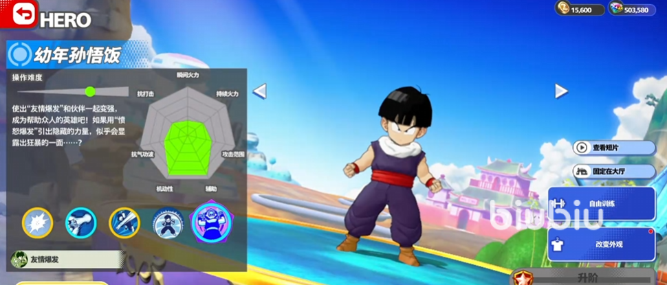 幼年孙悟饭别看个子小小机动性和辅助能力是比较强的,操作难度也较高,能够用友情爆发让队友和自己一起变强,还可以用愤怒爆发把隐藏起来的力量引出来。