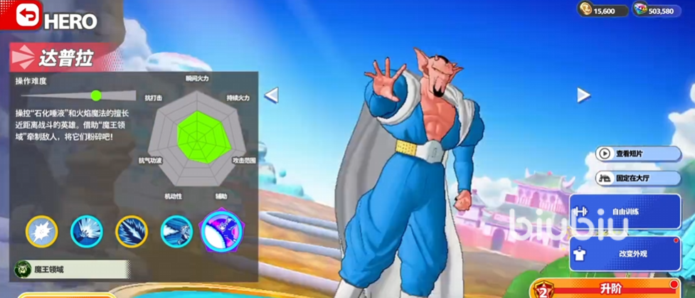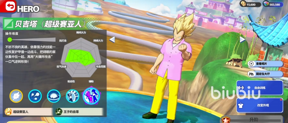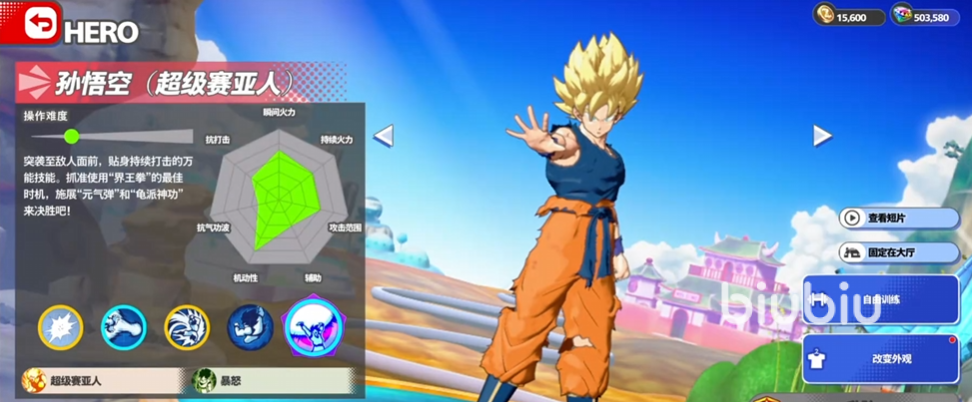首先第一个分享的是孙悟空超级赛亚人,他的操作难度是比较低的,机动性很强,能够突袭到敌人的面前,然后贴身使用界王拳打击对方,此外还有元气弹和龟派神功等技能。