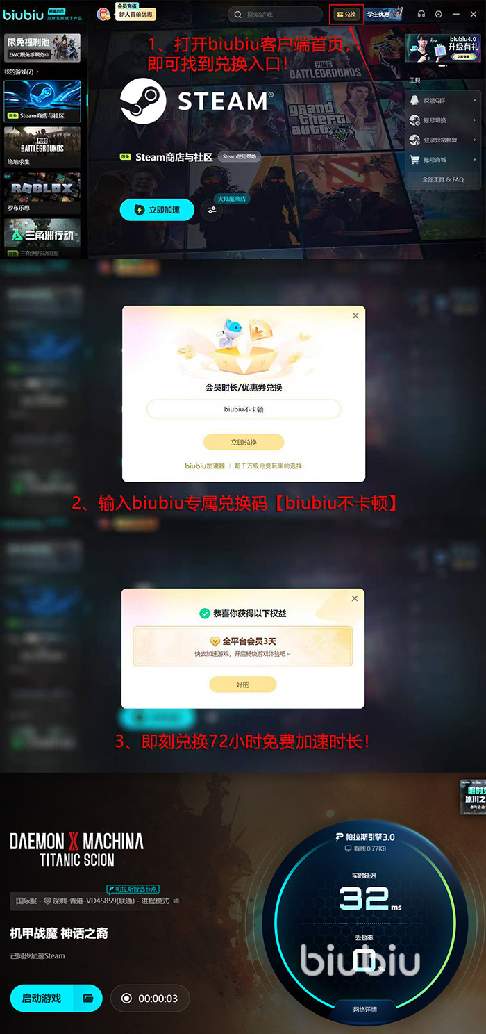 除此之外,biubiu还和荣获过冠军的Aixleft选手一起,对biubiu的体验以及操作模式等进行深度优化。近期,biubiu启动多个活动,让大家可以免费体验新biubiu的各功能,比如新人活动让新用户注册就能有24小时体验时间,而老用户回归后,还能和新用户一起使用【biubiu不卡顿】兑换码,在首页兑换到3天加速时间,需要注意两点,第一兑换码一个账号仅能使用一次,二是,新人2个活动的时间能累积到96小时,不抵消。