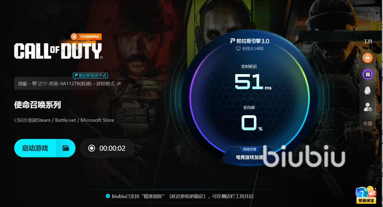 在操作层面,biubiu保持了简洁直观的设计。玩家打开客户端,在搜索框输入“使命召唤19”,选择加速模式并点击开启,系统会自动完成优化配置。选择加速模式并点击开启,系统就会自动完成优化,省去繁琐步骤,整个优化过程自动完成。运行非常轻巧,不影响电脑速度,使用过程无卡顿,不仅能解决cod19闪退,还能支持其他常见的多人联机游戏,让玩家一次解决多款游戏的加速需求。