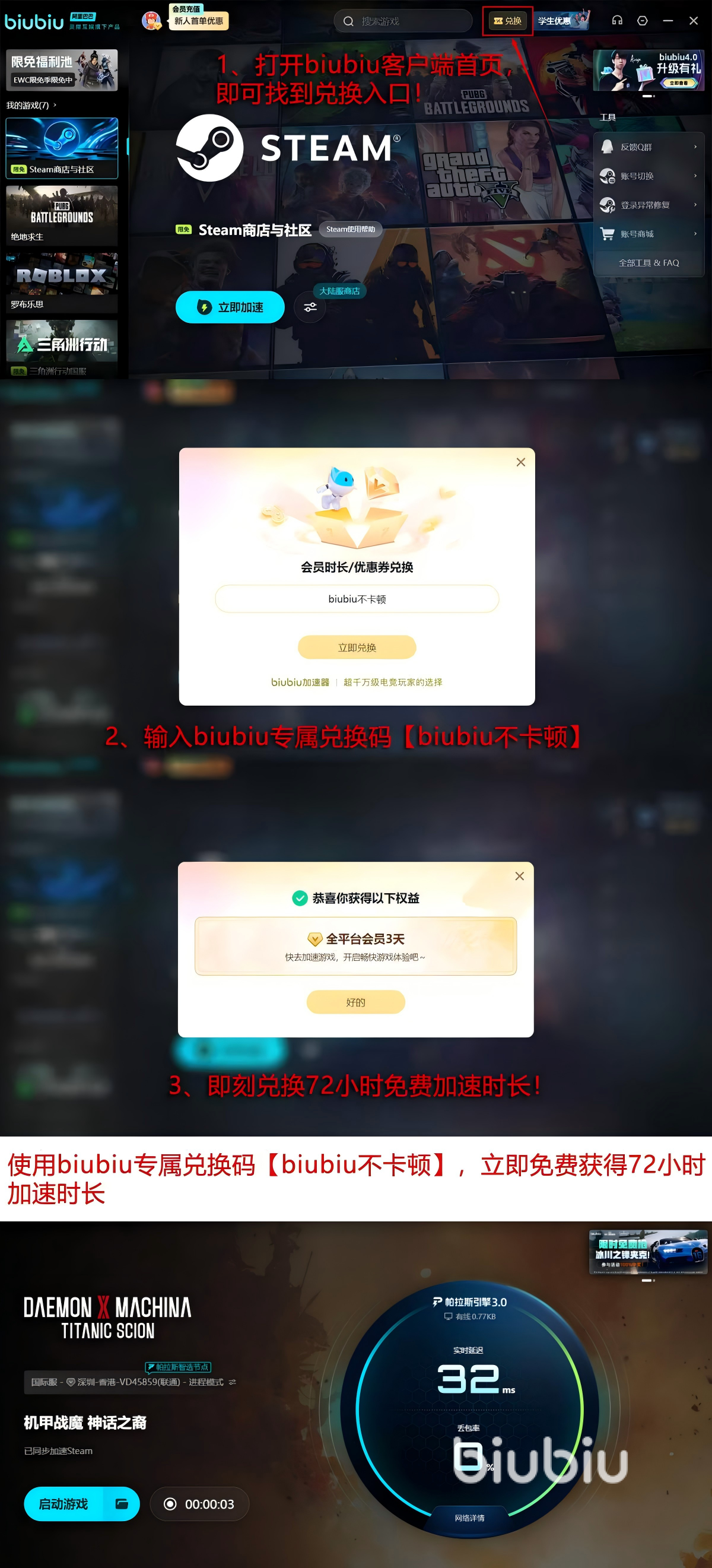 biubiu可不小气,刚认识的新人都能拿到见面礼,首次登录会得到24小时新人专属免费加速时间,其次首页兑换栏这里,【biubiu不卡顿】用上后还能换来72小时额外使用时间,新人其实可好好享受的服务时间为96小时,抓紧领取,好时机不能错过。